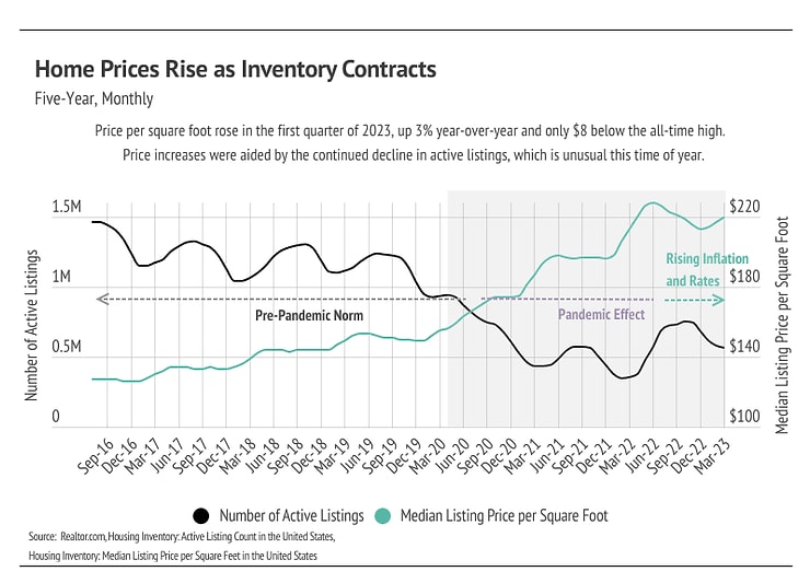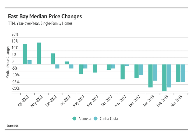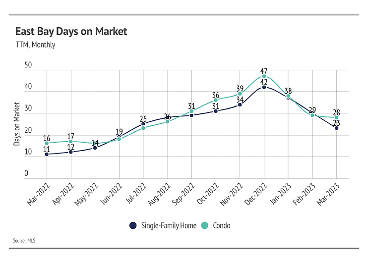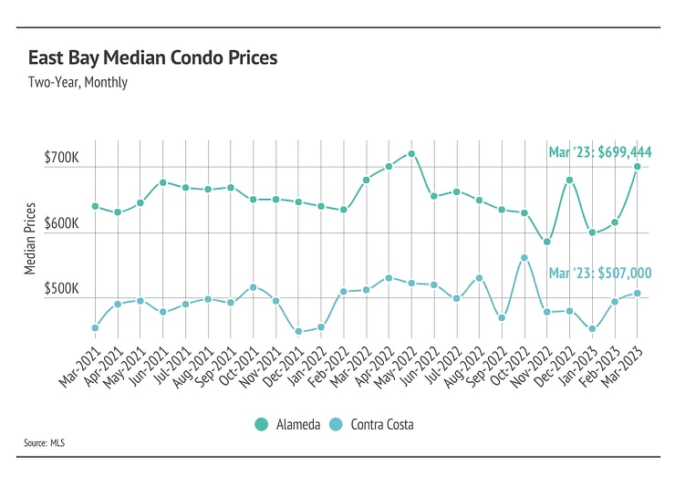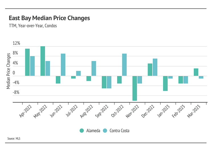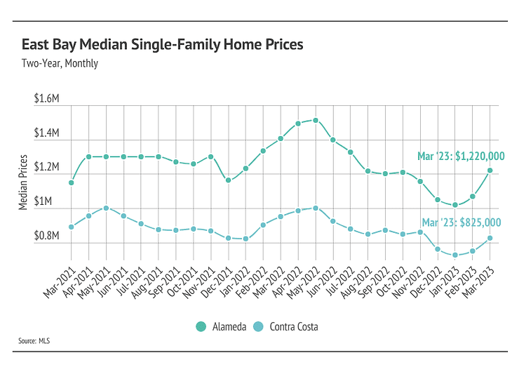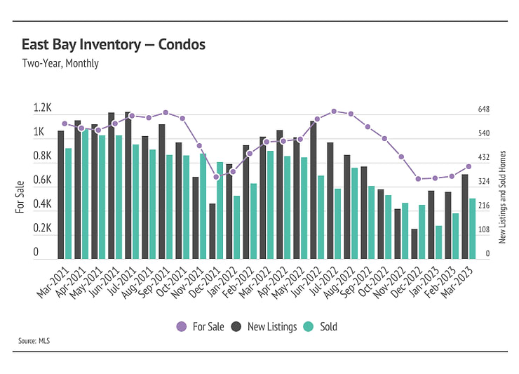 - Active listings in the East Bay rose in February and March, showing signs that inventory will follow normal seasonal trends, albeit at depressed levels.