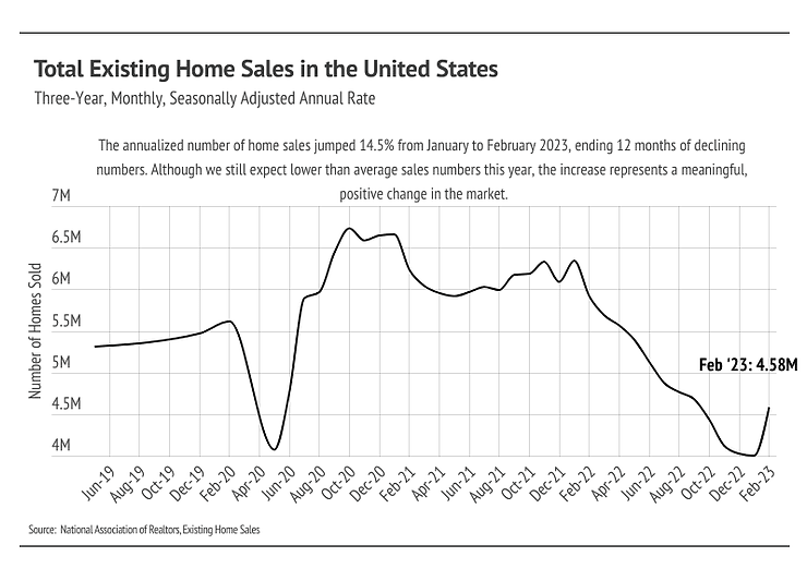 The 30-year average mortgage rate has been above 6% for six months now, and a significant number of buyers are finally coming back to the market. According to the National Association of REALTORS® (NAR), sales jumped 14.5% in February, the largest month-over-month increase since July 2020, breaking the 12-month streak of declining sales. We attribute three main factors to the increase: (1) the initial sticker shock of higher rates has worn off, (2) the time before buyers refinance has shortened, and (3) typical seasonality has returned. As rates shot up in 2022, affordability plummeted, causing a huge number of potential buyers to get priced out of the market or, at least, reassess purchasing a home. As inflation continues to decline, the Fed has offered a clearer picture of their path. They will raise the federal funds rate through 2023 to around 5.5% and then lower rates by about 2% over the course of 2024 and 2025. Buyers, who are expecting to refinance, therefore, have more of a timeline for when they can expect lower rates. The monthly mortgage cost is reduced by 10% for every 1% decrease in the mortgage rate, so buyers can greatly reduce their monthly cost as rates fall.