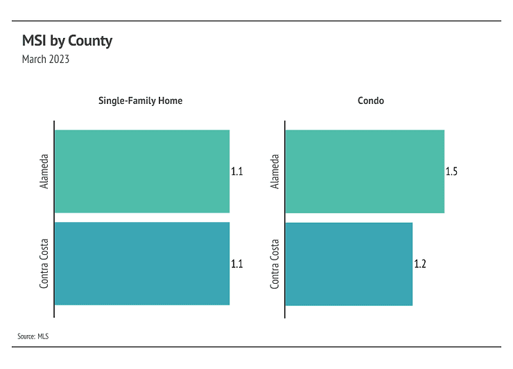 - Home prices rose meaningfully in the first quarter of 2023, up 15.2% for single-family homes in Alameda and 8.4% in Contra Costa. Condo prices rose 2.9% in Alameda and 4.2% in Contra Costa, indicating that unusually low inventory is once again driving pricing despite higher mortgage rates.