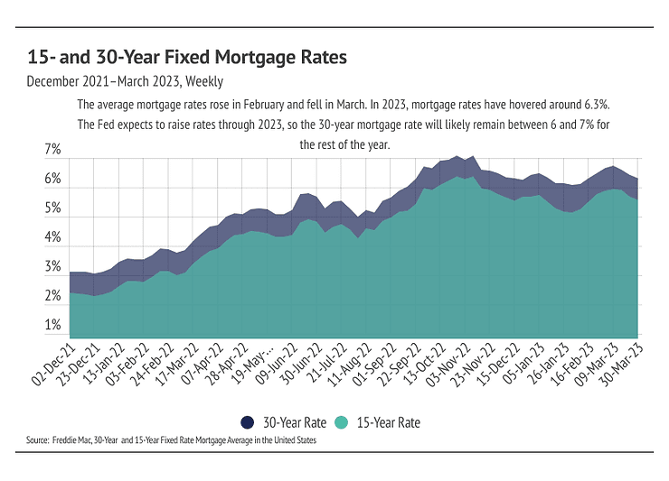 The Fed, which coincidentally met right after the bank failures, chose to raise their benchmark rate by 0.25%, rather than the anticipated 0.50%, in a continuing effort to combat inflation. The Fed chose the smaller 0.25% hike because banks were already tightening after the bank failures, so the Fed had less of a need to do so as well. Inflation is still well above the 2% target, although it’s coming down steadily. At the current rate at which inflation is dropping, it should be back to the target rate in about a year. One caveat that could slow declining inflation is OPEC’s surprise announcement that they are cutting oil production, which will cause gas prices to increase over the next few months. All this to say, interest rates will remain elevated and volatile over the next 12 months, and, more specifically, mortgage rates will likely hover around 6-7%.